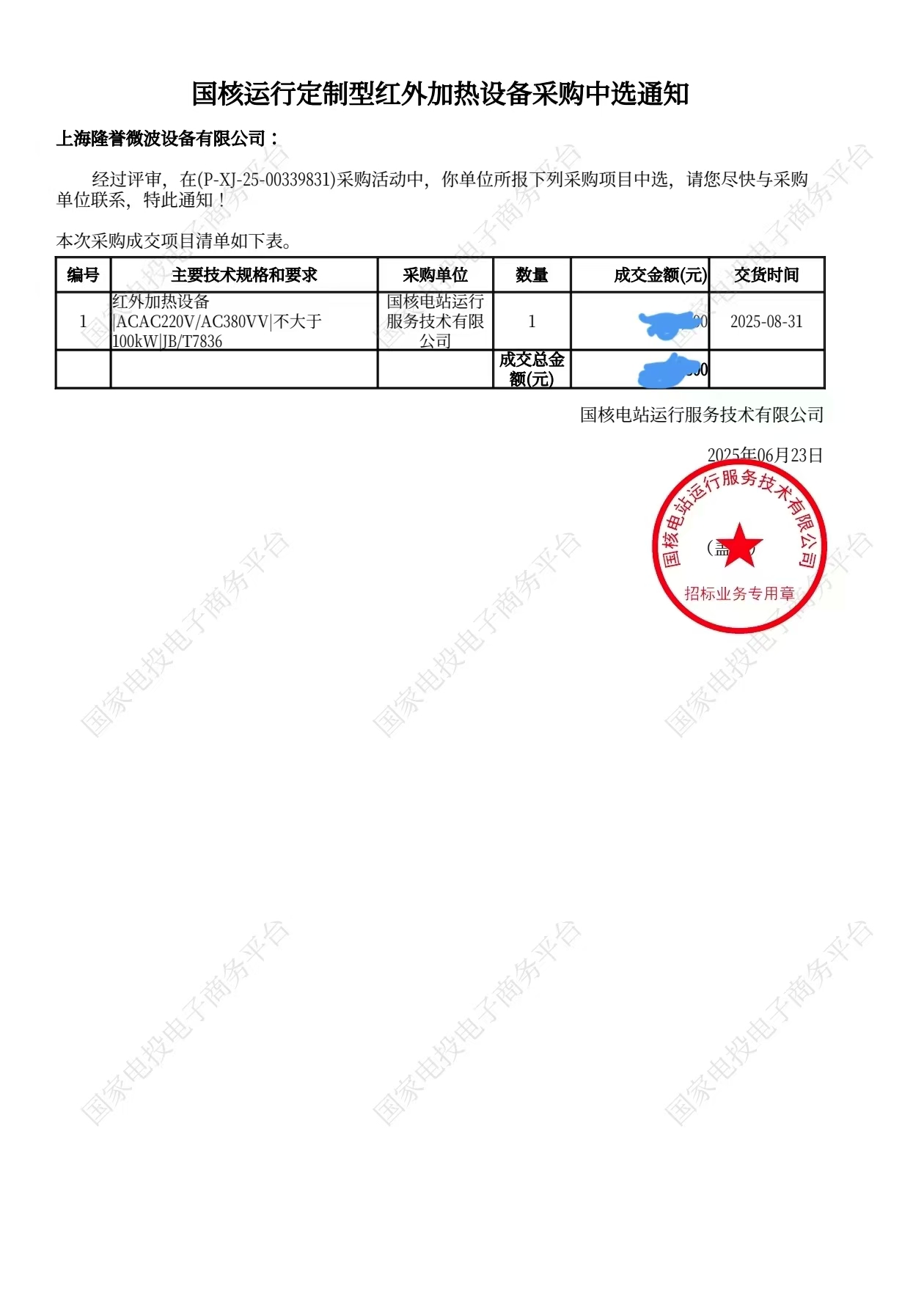 恭喜上海隆譽微波設(shè)備有限公司中標國核運行定制性紅外加熱設(shè)備